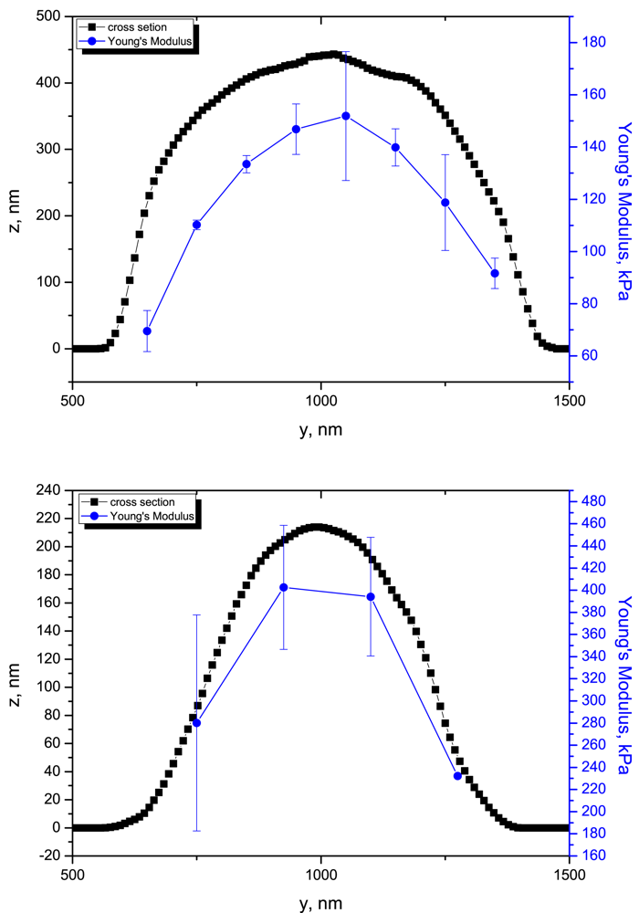 Figure 9 shows the Young's modulus at different cross section positions for particles synthesised with 20% AAc at 20 °C and 70 °C. The Young's modulus increases and decreases in accordance to the particle height as was reported before [24]. For both temperatures, the stiffness decreases from the centre to the edges of the microgel. This result is in good agreement with the literature [19] since a core-shell structure is introduced for the particle morphology with its higher cross-linked core and the lower cross-linked shell. The stiffness doubles itself from 20 to 70 °C. Since the Young's modulus was determined for at least three particles, the pronounced error bars in the centre of the microgel indicate an inhomogeneous microgel character. This suggests that the inner morphology differs from particle to particle.