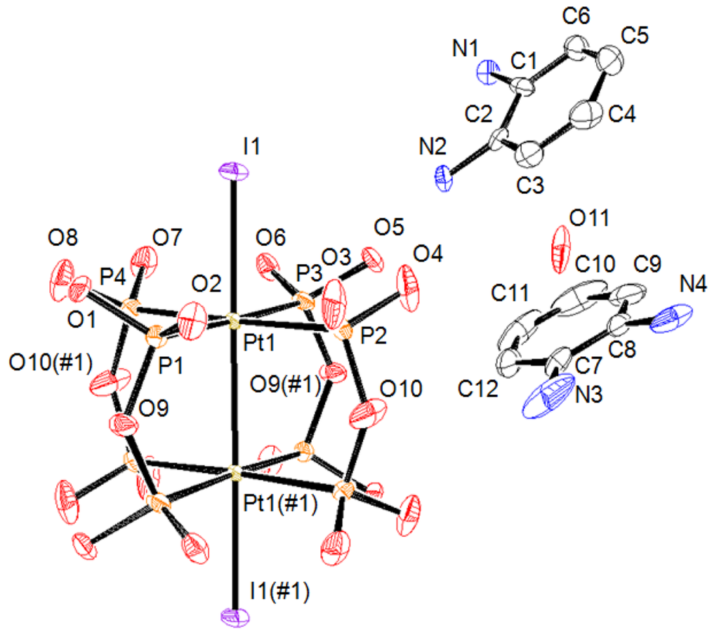 - Clark, R.J.H.; Kurmoo, M.; Dawes, H.M.; Hursthouse, M.B. Binuclear platinum diphosphite complexes: X-ray crystal structures of K4[Pt2(pop)4Cl]·3H2O and K4[Pt2(pop)4Br2]·2H2O (pop = P2O5H22−). Inorg. Chem. 1986, 25, 409–412. [Google Scholar]