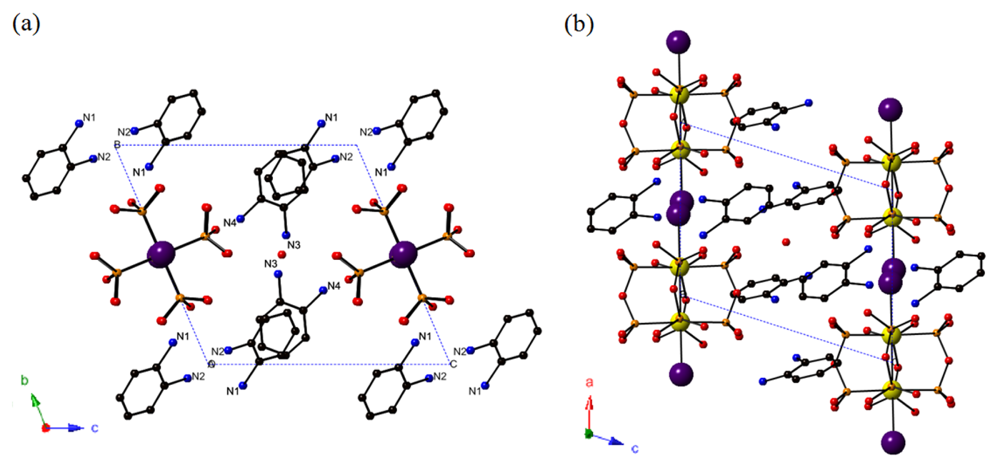 In addition, the short intermolecular N1–N2 distance (2.858(10) Å) suggests the existence of hydrogen bond between −NH2 and −NH3+ group. Focusing on the o-(H3N(1)C6H4N(2)H2)+ molecules, this N-H···N hydrogen bond induces the pairing of neighbor two molecules as shown in Figure 3(a). In case of o-(H3N(4)C6H4N(3)H2)+ molecules, relatively short N-O distances, d(N3-O11) = 3.031(12) Å and d(N4-O11) = 3.065(13) Å, suggest the existence of some interactions between these molecules and lattice water molecules. Although the position of the hydrogen atoms are unclear, N-H⋯O and N⋯;H-O hydrogen bonds are possibly the origin of these interactions. As shown in Figure 3(b), a o-(H3N(4)C6H4N(3)H2)+ molecule is paired with another one via a lattice water molecule.