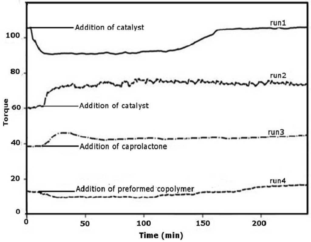 In runs 2 and 3, the torque increased immediately when the catalyst was added probably due to CL polymerization. The copolymer addition in run 4 did not lead to an immediate evolution of the torque: a slow and continuous increase of the reactor torque was observed suggesting a continuous evolution of the reactive system.
