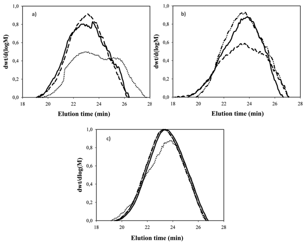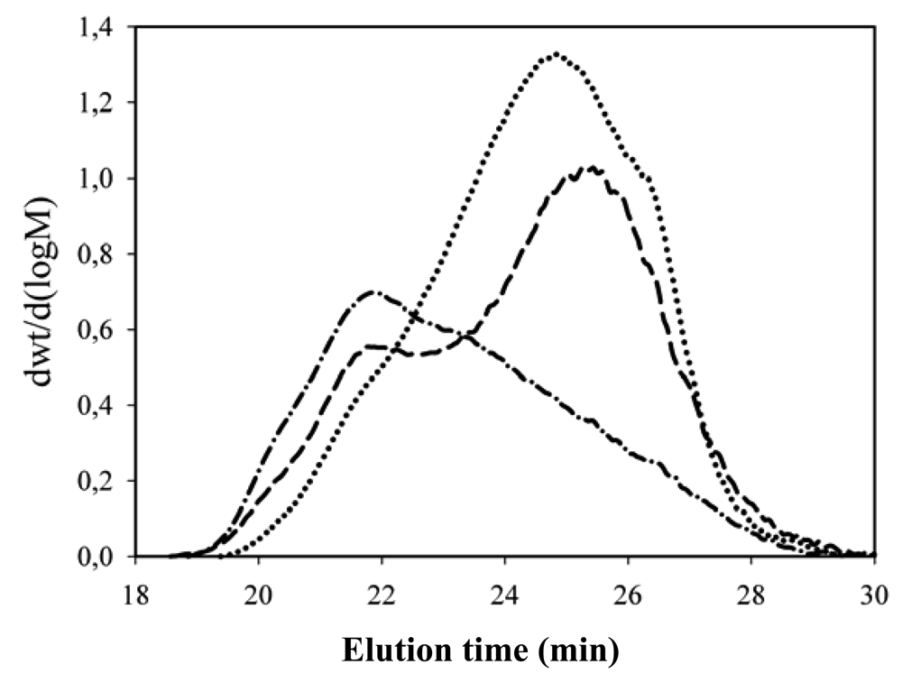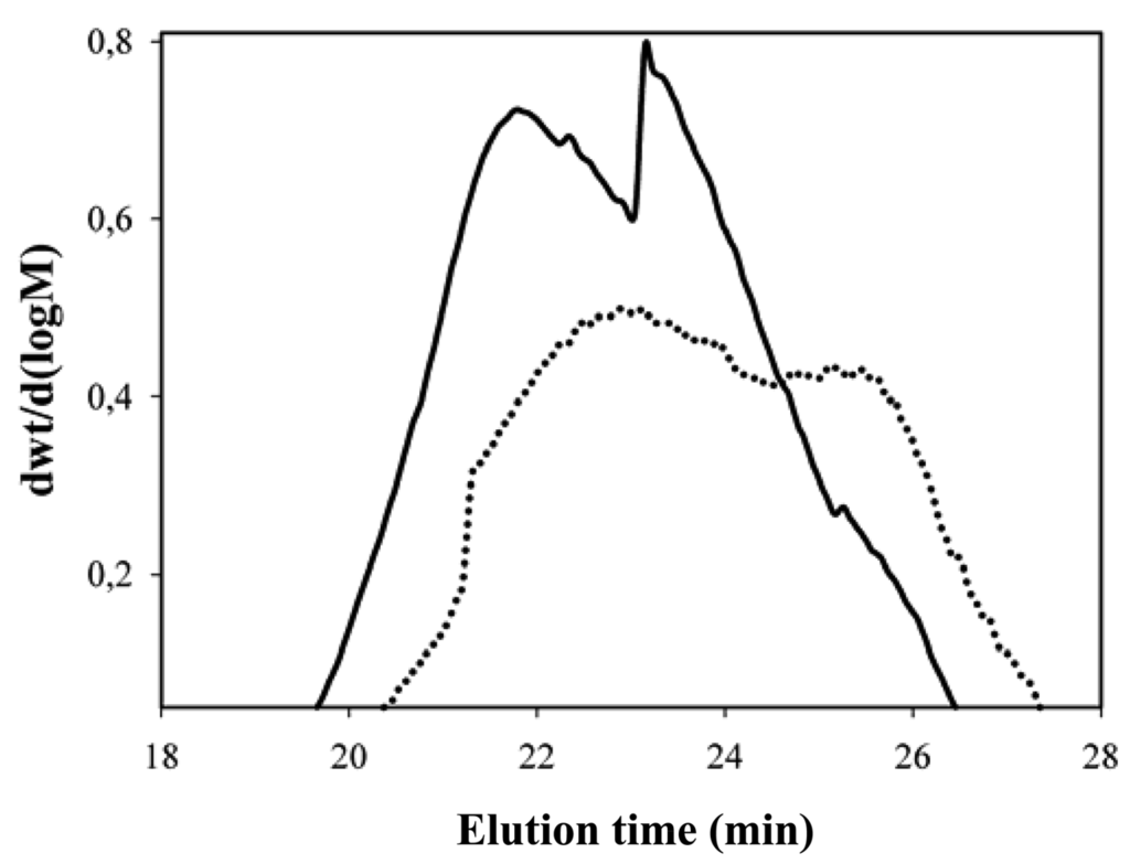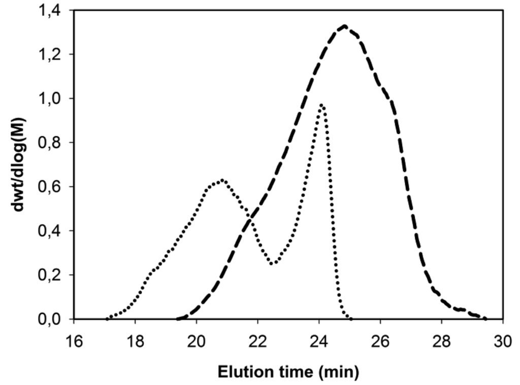Solutions of DMSO containing 18 mg/mL of the product were prepared at 120 °C and analyzed using a WATERS-GPCV 2000 SEC apparatus equipped with three columns: shodex HT807, shodex HT 804 and shodex HT 803. The injector and column compartment were maintained at 120 °C and the pump compartment at room temperature. The pump flow was 1 mL/min. A refractometer coupled with a viscosimeter were used as detectors. Universal calibrations were realized with PMMA standards.