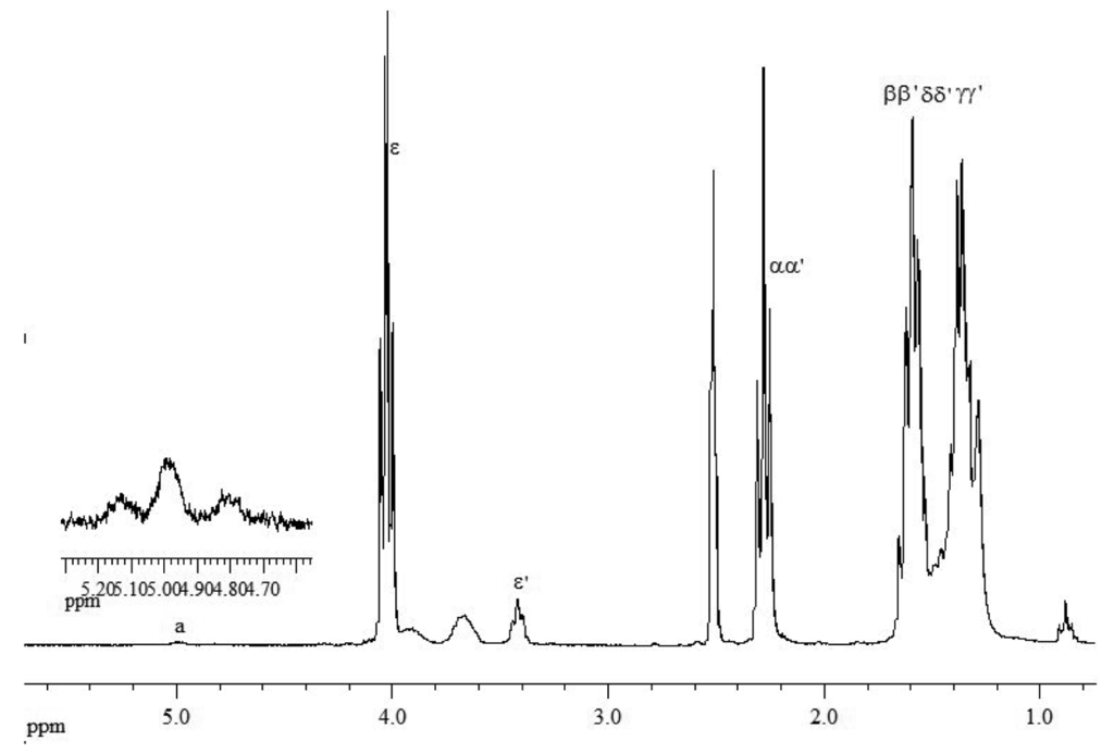 1H NMR spectra of specimens were taken during runs 1–4 (Figure 4, Scheme 2). They were analyzed as described in detail in a previous study [11]. Substitution rates of EVOH and the DPn of the CL were calculated. Results are given in (Table 2).