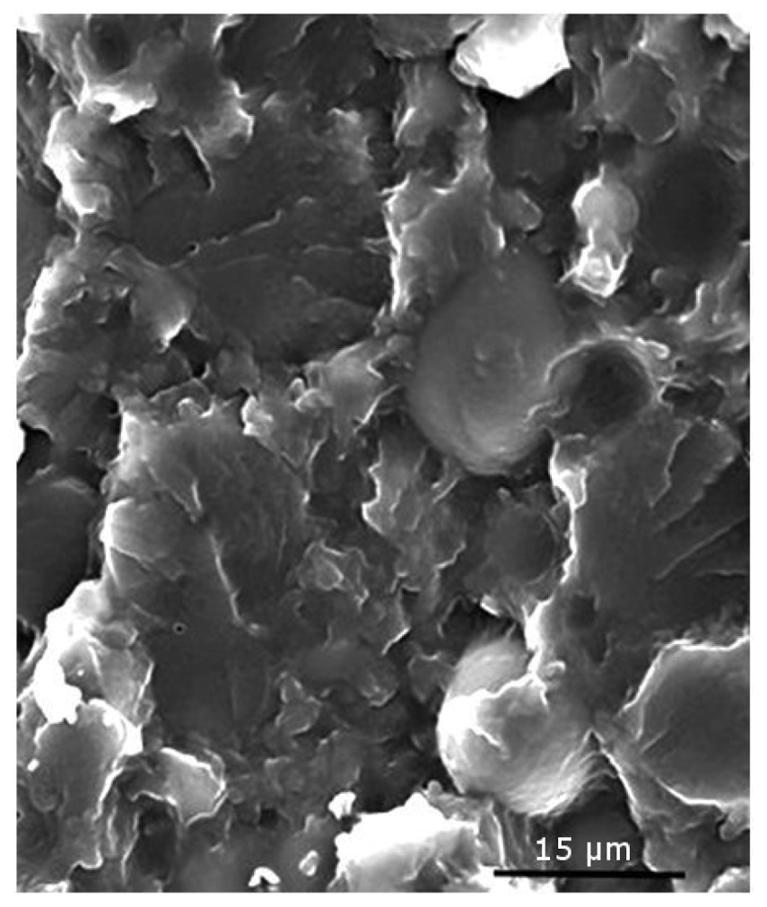 Runs 6 and 7 evaluate the effect of in-situ formed EVOH-g-PCL on grafting reactions. Run 7 contain twice more CL than in run 6. The results are presented in (Table 4). After 30 min of reaction, substitution rate obtained was 6.5% for run 6 and increased to 15% obtained in run 7. The structures as determined by NMR and DSC were unchanged for higher reaction times. SEC (Figure 6) obtained after 60 min of reaction showed a molar mass increase when CL concentration increased. SEM image of the product obtained shows PCL dispersion with a diameter of 7 μm (Figure 7). All these results are coherent and indicate that increasing the ε-caprolactone amount led to a faster formation of graft copolymer by grafting from, and also to, a better homogenization of the reactive system.