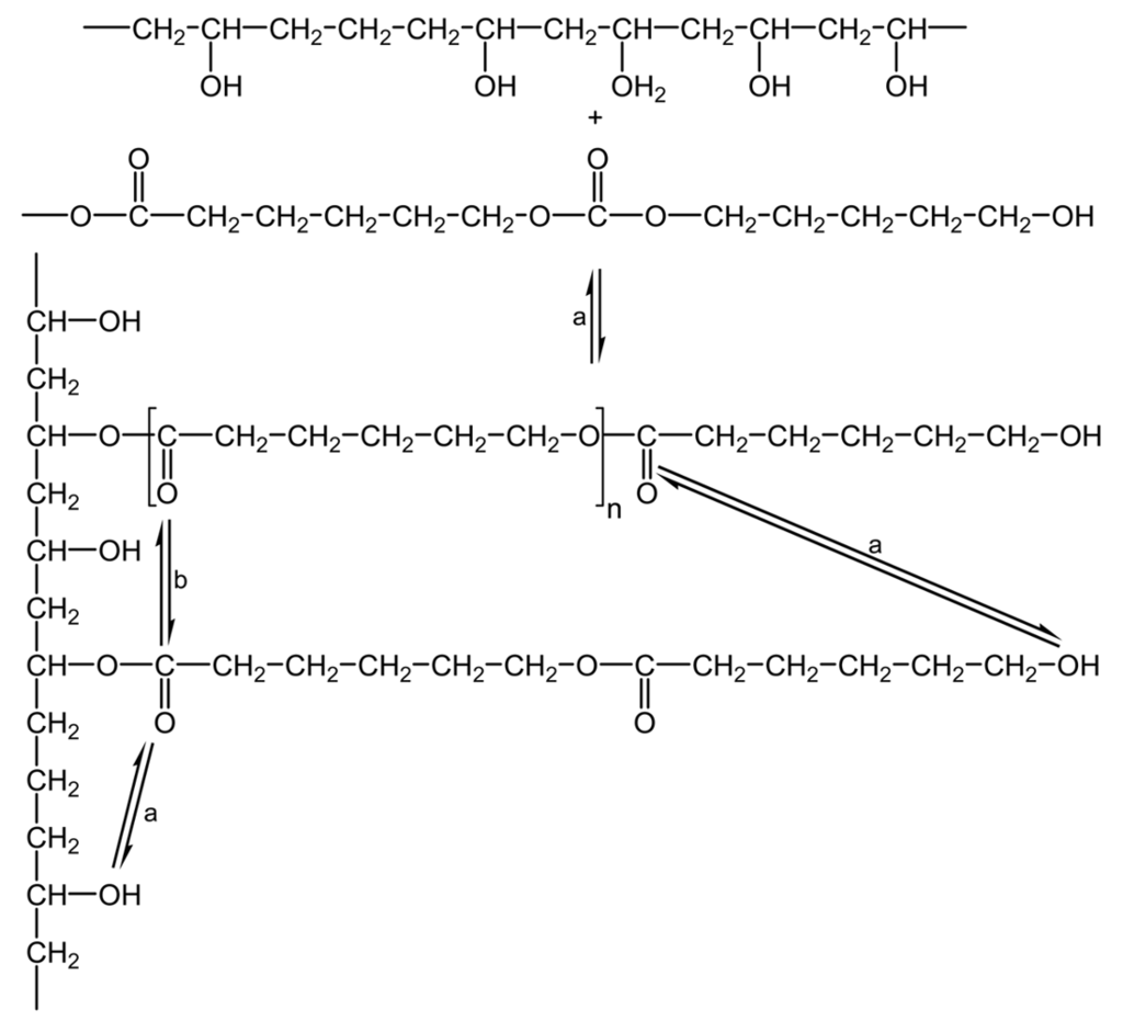 Alcoholysis is a reaction between alcohol groups of poly(ethylene-co-vinyl alcohol) and esters groups of non graft poly-ε-caprolactone. Poly-ε-caprolactone alcohol chain end reacts with graft ε-caprolactone ester groups. Poly(ethylene-co-vinyl alcohol) alcohols graft poly-ε-caprolactone esters. In addition, transesterification between ester groups of graft and non graft poly-ε-caprolactone is probable.