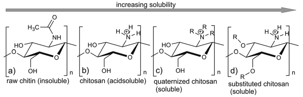 The biological properties of these compounds depend strongly on their solubility in water and other commonly used solvents. In its crystalline form, chitosan is normally insoluble in aqueous solutions above pH 7; however, in dilute acids, the protonated free amino groups facilitate the solubility of the molecule. The pKa of primary amino groups depends closely on DA, so the solubility of chitosan is also dependent on DA [6]. Being a highly insoluble and chemically rather unreactive material, chitin has a much lower applicability than chitosan. Recently, there has been growing interest in the chemical modification of chitosan and chitin (e.g., [32-35]) in order to improve their solubility and extend their applications (e.g., [7,19,36,37]).