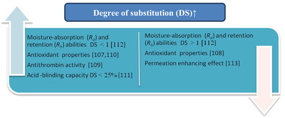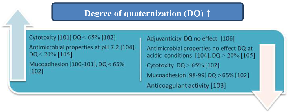 Sajomsang et al. [102] synthesized methylated N-aryl chitosan derivatives, methylated N-(4-N,N-dimethylaminocinnamyl) chitosan chloride (MDMCMCh) and methylated N-(4-pyridylmethyl) chitosan chloride (MPyMeCh) consisting of a variety of N-aryl substituents. The effects of the degree of quaternization (DQ) on mucoadhesion and cytotoxicity were investigated and compared to N,N,N-trimethylammonium chitosan chloride (TMChC). It was found that mucoadhesion and cytotoxicity increased when DQ was increased to 65%, but decreased with DQ > 65%. The influences of the quaternary and acyl groups on the in vitro anticoagulant activity of N-propanoyl-, N-hexanoyl-and N,O-quaternary substituted chitosan sulphate were also investigated [103]. It was established that the anticoagulant activity of the chitosan sulphate was enhanced by the N-acyl groups, whereas the quaternary groups decreased this activity. The influences of these groups may be attributed to the change in negative charge density and the arrangement of chitosan sulphate.