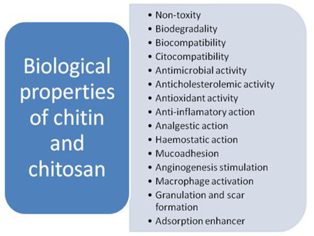 Chitin and chitosan possess very interesting biological properties (Figure 2); therefore, they have been used in many applications, mainly in the medical and pharmaceutical fields [4,17,19,21-30]. Not all biological activities have been observed with every chitin/chitosan preparation [31].