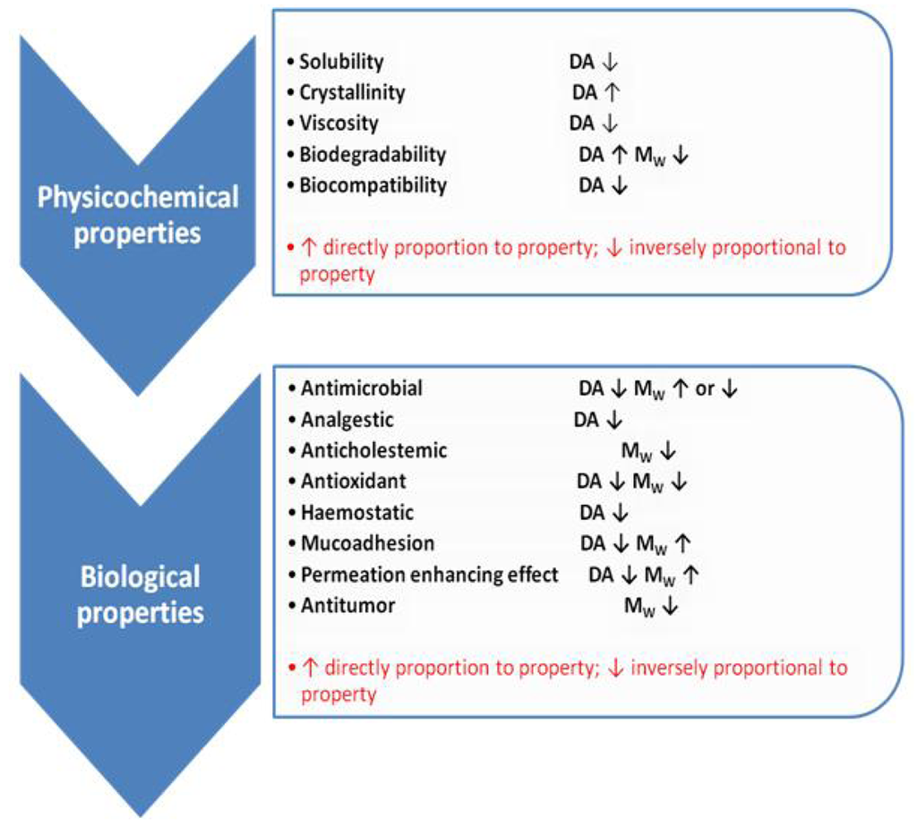 Knowledge of the microstructure of chitosan samples is essential for understanding the structure-property-activity relationships of chitin and chitosan products [18,38-42]. To date, only the effect of weight-averaged molecular weight (MW) and degree of N-acetylation (DA) on the physicochemical and biological properties of these compounds has been intensively investigated. The results are summarized in a number of papers, (e.g., [17,21,43-46]). Selected relationships between the structural parameters DA and MW, and the physicochemical and biological properties are presented in Figure 3.