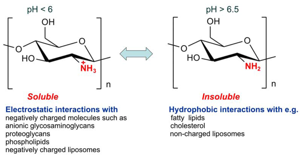 At pH > 6.5 chitosan solutions exhibit phase separation, while at pH < 6.5 chitosan is soluble, carrying a positive charge because of the presence of protonated amino groups [67]. At pH between 6.0 and 6.5 in solution, the free amino groups of chitosan molecules become less protonated and hydrophobicity along the chitosan chain increases. Therefore, chitosan self-aggregates could be formed in acetate buffer solutions by intra- and inter-molecular hydrophobic interactions. As a cationic polyelectrolyte, at low pH (less than about 6) chitosan can electrostatically interact with negatively charged molecules or polymers, e.g., anionic glycosaminoglycans, proteoglycans, and other negatively charged molecules. At higher pH (above about 6.5) chitosan's amino groups are deprotonated and hydrophobic interactions with several substrates (e.g., fatty acids and cholesterol) can appear (Figure 5) [21].