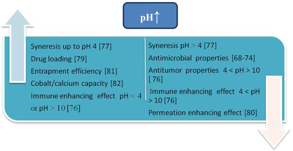The pH values of the medium also determines the stability of chitooligomers with the degree of polymerization (DP) < 20, which can be achieved by depolymerization of chitosan [75]. These compounds have various biological activities such as antitumor and immune enhancing effects [76], but can easily turn brown during shelf life, which influences their properties and limits their applications in many fields. It was established that the pH of chitooligomers for their optimal preservation should be below 4 or above 10, and in an oxygen-free environment. It was also reported that syneresis (the major properties of hydrogels, which allows a more stable state to be achieved than the initial state of chitin gels) depends on pH [77].