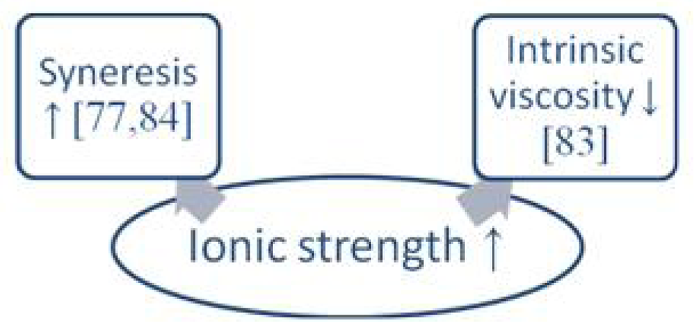 Vachoud et al. [77] examined the role of the concentration of KCl initially present in the hydroalcoholic solution on gel formation, syneresis and the mechanical properties of the gel for two values of R—2.5 and 10—where R the molar ratio of Ac2O-amine residues used for its preparation. It was established that the time necessary to achieve the gel point increased with KCl concentration independently of R. In the presence of salt, the rate of solvent exclusion during syneresis decreases when the concentration of salt increases for these two gels.