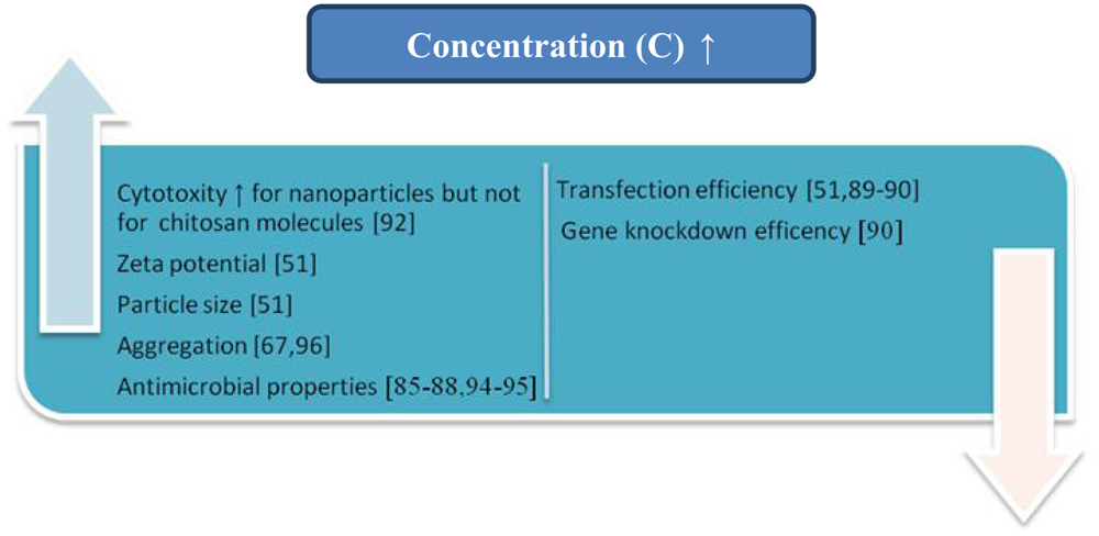 Apart from the influence of the chitosan concentration on its antimicrobial behavior, this parameter determines the properties of chitosan-based formulations for gene delivery systems [51,89,90]. It was established that the particle size of the chitosan/siRNA complex prepared by simple complexation increased when the concentration of chitosan was raised [51]. The comparative positive value of the surface charge (zeta potential) of chitosan-siRNA complexes also increased with the rising concentration of chitosan at a constant siRNA concentration. The transfection efficiency of the polyelectrolyte obtained depends on the mixing molar stoichiometry of DNA to chitosan (N/P ratio) [51,89,90]. Sajomsang et al. reported that the highest gene transfection efficiencies of all N-aryl chitosan derivative/DNA complexes were observed at N/P ratios 5 due to the smallest particle size (95–124 nm) [89].