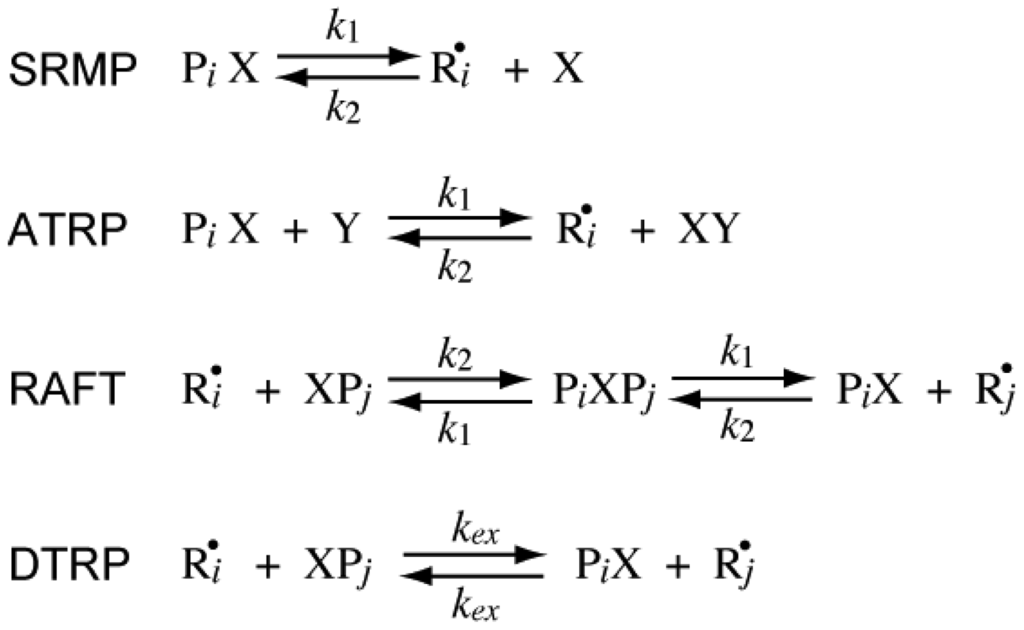 The reversible deactivation reactions for various types of RDRPs are shown in Figure 1. In SRMP and ATRP, an active radical is protected from termination reactions by reversible capping with a trapping agent, reducing the frequency of bimolecular termination. On the other hand, in RAFT it is not required to reduce the frequency of bimolecular termination, and the pseudo-livingness is attained if an active radical is transferred to a large number of chains before finally being stopped by bimolecular termination. The DTRP could be considered as a special case of RAFT with k1→∞. In an ideal DTRP, the polymerization rate is the same as the conventional nonliving free radical polymerization without using the chain transfer agent.