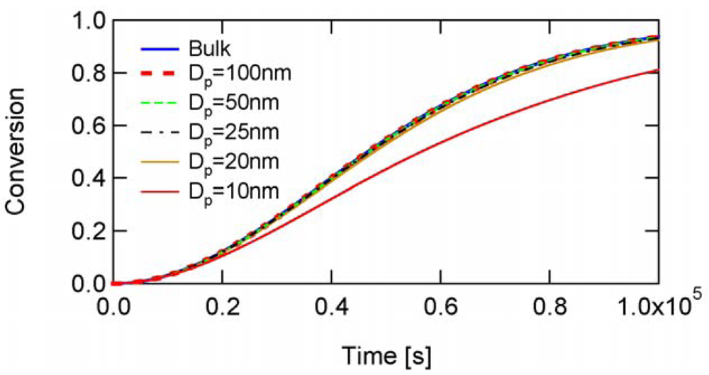 To determine the a-value, first consider the conventional nonliving FRP. Figure 14 shows the conversion development of the conventional nonliving FRP with various particle sizes, obtained from the MC simulation. The parameters used are the same as RAFT-11 in Table 2, except that the RAFT agent is not used here. At Dp = 25 nm, the MCV effect is so significant that the polymerization rate is smaller than that for Dp = 50 and 100 nm.