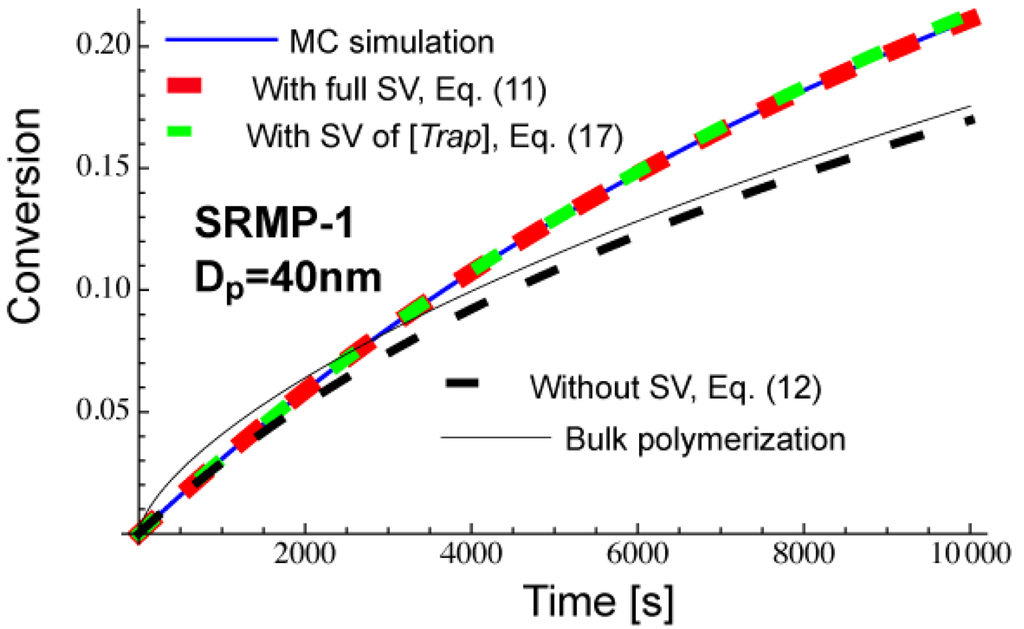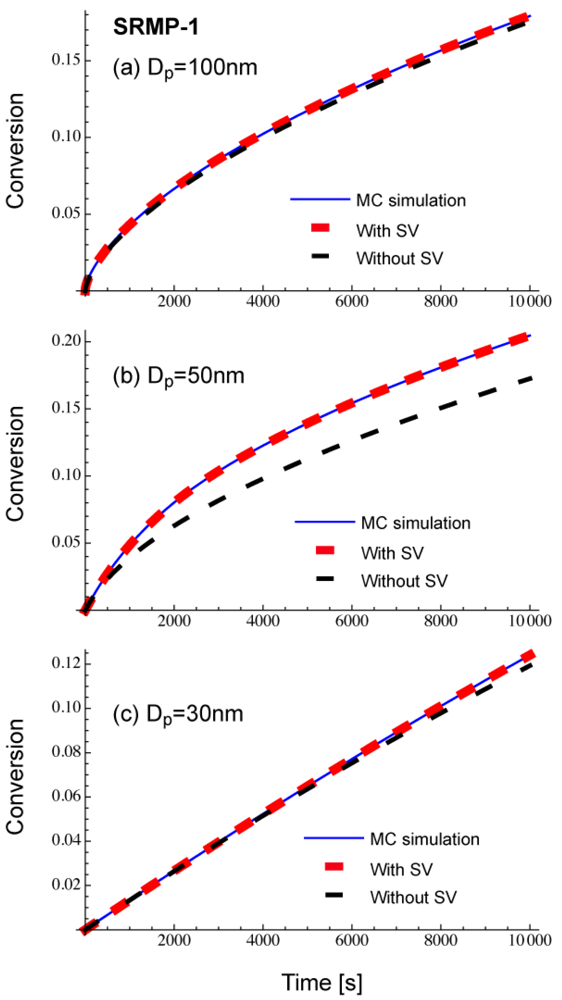 As shown in Figure 3, Equation (11) that accounts for the statistical variation agrees completely with the MC simulation results. On the other hand, when Equation (12) that does not account for the statistical variation of concentrations is used, clear deviation is observed for Dp = 50 nm, while the prediction from Equation (12) could be a reasonable approximation for Dp = 100 nm and 30 nm. Figure 3 shows there exists a particle size region for an SRMP in which the statistical variation among particles is vital. This region corresponds to the acceleration window observed for SRMP and ATRP [10,13,14].