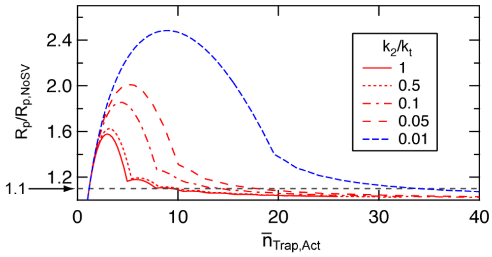 Assuming about 10% increase in polymerization is considered significant (Rp/Rp,NoSV = 1.1 shown by a broken line in Figure 12), -value is about 10 for k2/kt > 0.5, and is about 20 for k2/kt around 0.05. The -value larger than 30 is needed for k2/kt < 0.01. For the calculation condition shown in Figures 3, 5, and 6 (SRMP-1), k2/kt = 1, and is about 10.