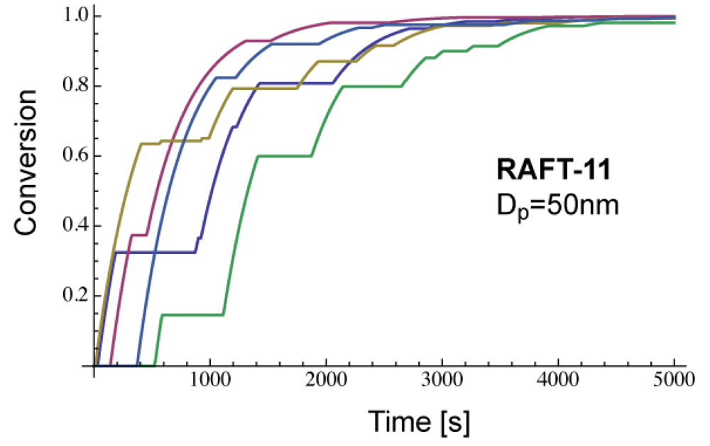 Figure 13 shows the conversion development in each particle, obtained by the MC simulation for RAFT-11 with Dp = 50 nm. The first 5 particles simulated are shown. The conversion development is different significantly among particles, i.e., the monomer concentration differs significantly at the same reaction time.