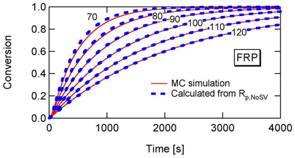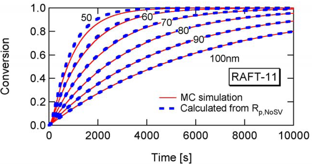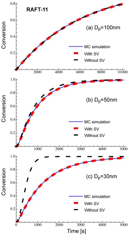 Figure 15 shows the ratio between Rp and Rp,NoSV at conversion x = 0.1. Figure 16 shows the comparison of the conversion developments obtained from Rp and R p,NoSV. From these figures, a noticeable statistical variation effect is observed for Dp < 80 nm. By setting Equation (25) leads to obtain a = 10.3, and therefore, the applicability of a = 10 is now examined for the RAFT cases.
