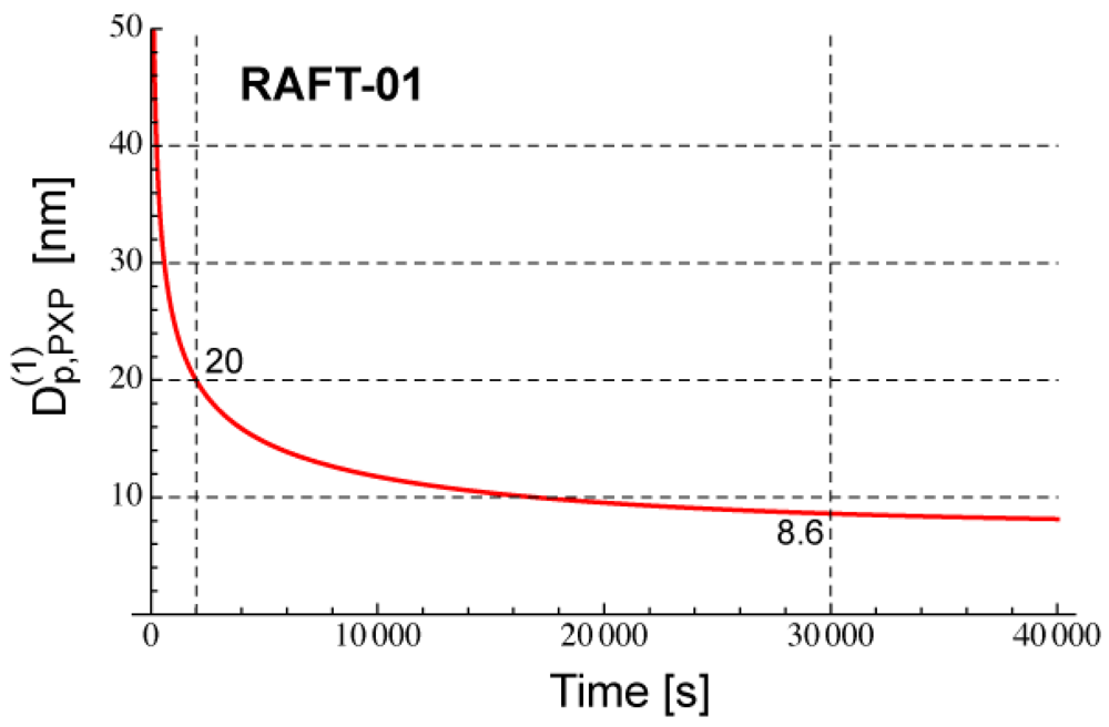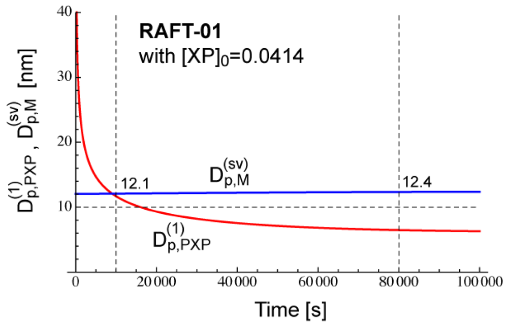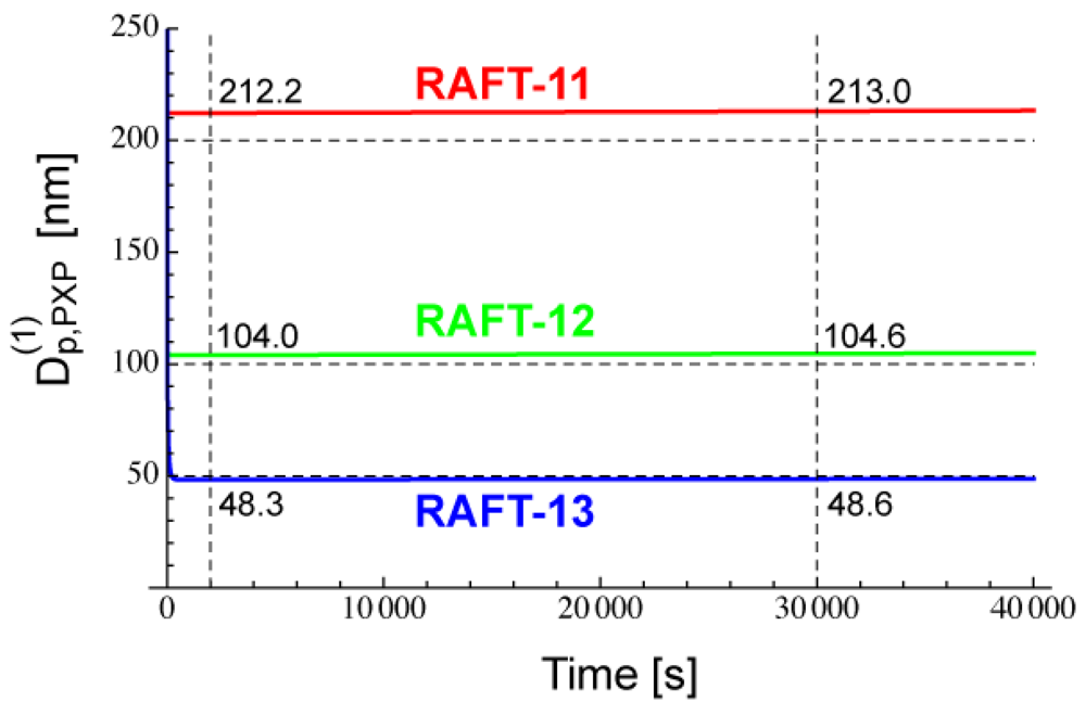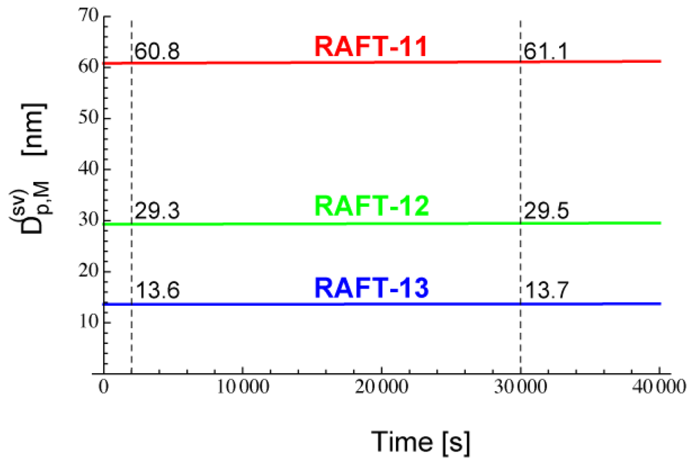 Figure 17 shows the calculated developments for RAFT-11, -12, and -13, using Equation (25) with a = 10. For RAFT-11, the statistical variation effect is predicted to be significant for Dp smaller than about 60 nm. Figure 18 shows the ratio between Rp and Rp,NoSV that does not account for the statistical variation effect. Figure 19 shows the comparison of the conversion developments obtained from Rp and Rp,NoSV. From Figures 18 and 19, it is confirmed that obtained from a = 10 is a reasonable estimate below which the MCV effect becomes significant.