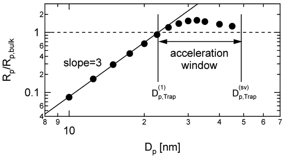 In order to develop a simple equation that can be used as a pointer to roughly determine the diameter below which the acceleration due to the statistical variation becomes significant let us assume The concentration of trapping agents in a particle with diameter Dp is given by Assuming this concentration is equal to [Trap]bulk. Therefore, the particle size below which the polymerization rate becomes larger because of the statistical variation effect, is given by: