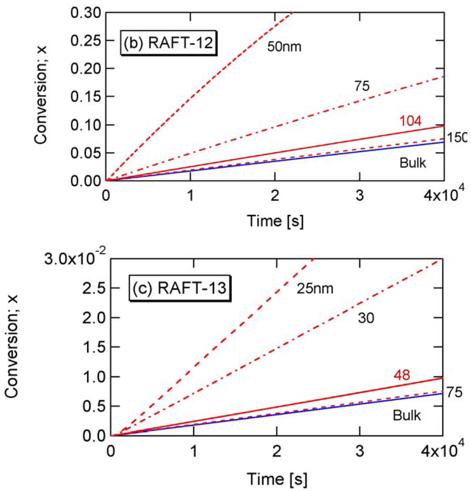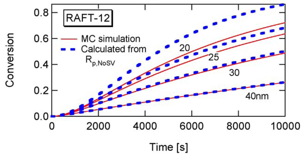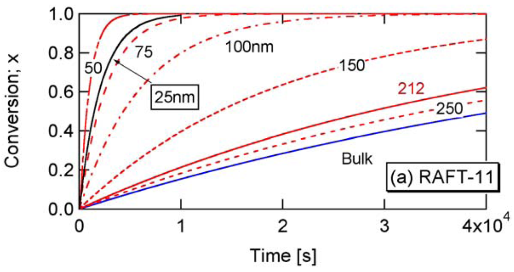 Now, look at the fundamental polymerization rate expression, Equation (5). For SRMP and ATRP, [Trap] ≪ [Interm], and [Trap] in a small particle may become larger than that in bulk. Because the denominator term, [Trap] becomes larger, it is expected that the polymerization rate becomes smaller when the particle size is decreased. On the other hand, for many RAFT systems, [Interm] ≪ [Trap], and [Interm] in a small particle may become larger than that in bulk. Because [Interm] is a numerator term, it is expected that the polymerization rate becomes larger by making the particle size smaller.