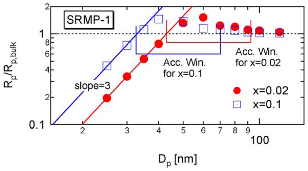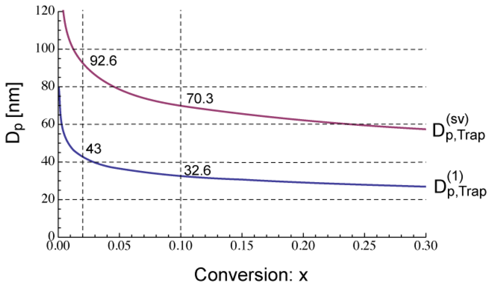 Figure 5 shows the calculated development of during polymerization under the condition SRMP-1, whose conversion development was shown in Figure 3. The -value decreases because [Trap]bulk increases with time. In Figure 5, the -value whose equation will be shown in Section 4.1 is also shown. The acceleration window at conversion, x = 0.02 is predicted to be Dp = 43–92.6 nm, and that at x = 0.1 is Dp = 32.6–70.3 nm.