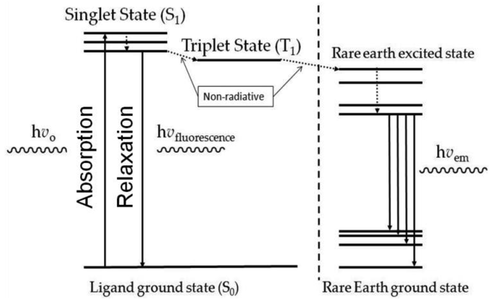 Energy transfer from the ligand to the RE-doped nanocrystal begins with the excitation of the ligand, as is illustrated in Figure 1. Organic ligands typically absorb energy in the near ultraviolet (UV) spectral region ranging from 200 nm to about 400 nm [15]. Typically, singlet spin states of the ligand are excited followed by intersystem crossing from the singlet state to the lowest triplet state within the ligand through thermal relaxation accompanied by the generation of heat. The occurrence of intersystem crossing is in competition with phonon deactivation of the excited singlet state and, potentially, fluorescence from the ligand [8]. Energy transfer may then occur from the triplet state of the ligand to the RE ion when the energy of the triplet state is reasonably equivalent to that of a suitable energy level of the dopant. Light emission from the RE ion results from the radiative transition between 4f states.