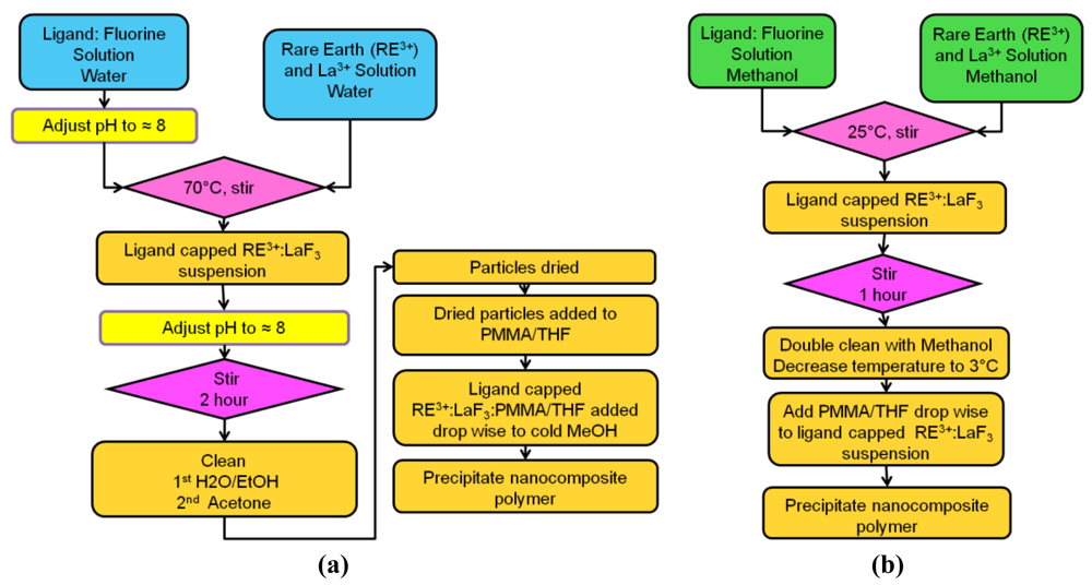 Tb3+:LaF3 nanocrystals were prepared in aqueous solutions with water as the solvent for the water process and methanol as the solvent for the methanol process. The water and methanol synthesis processes are depicted in Figure 10(a,b) respectively. The rare-earth solution of La(NO3)3·6H2O (9 mmol) and Tb(NO3)3·6H2O (2 mmol) in 16 mL of solvent, water and methanol respectively, was prepared at room temperature. NH4OH was added to the rare-earth solution in water to adjust the solution to pH 8. The pH of the methanol solution was not adjusted.