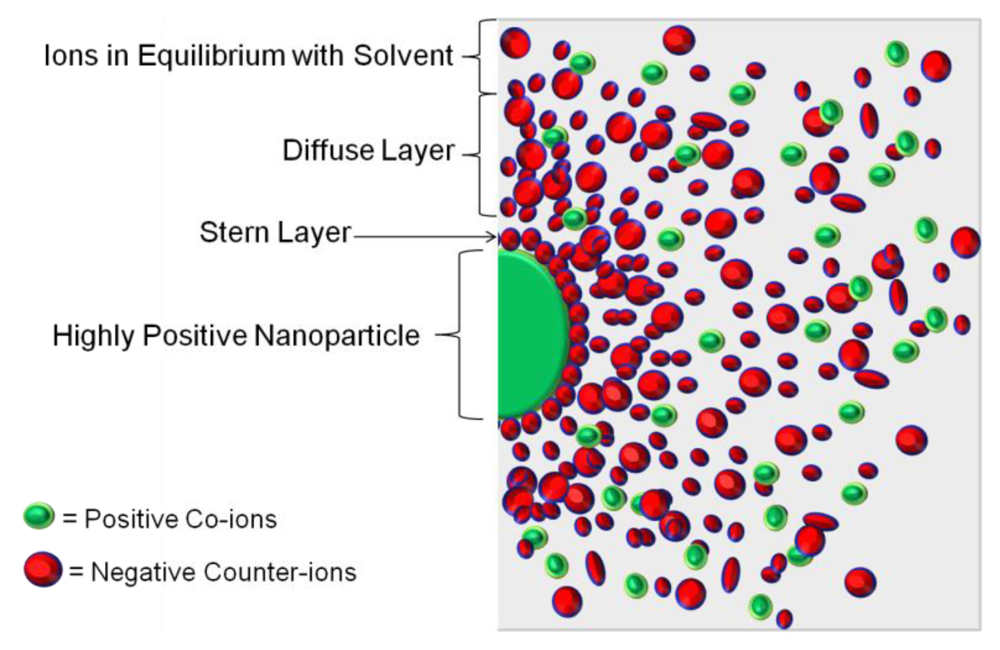 Nanoparticles, such as those employed here, generally refer to materials whose dimensions are within the range of 1–100 nm. At these small sizes, surface interactions strongly influence their properties [17]. The electrical double layer is a representation of the ion distribution at the interface between a solid and a solvent in solution/suspension as is illustrated in Figure 2. Helmholtz first introduced and termed the idea of the electrical double layer which was later extended by Gouy-Chapman and Stern [18-22]. The Stern layer is the first stratum that consists of a dense layer of ions of the opposite charge (counter ions) that form around the nanoparticle. The second layer is the diffuse layer which is the charged atmosphere of ions of the opposite charge to the nanoparticle that extends away from the Stern layer. The high concentration of counter ions within the diffuse layer gradually decreases with increasing distance from the nanoparticle until equilibrium is reached with the ion concentration in the bulk of the solvent [23].