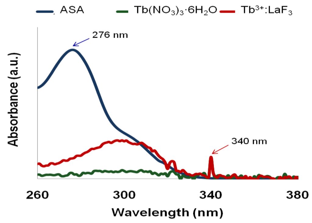 The main absorption peak for the ASA ligand is located at about 276 nm when the ligand is dispersed in water and methanol. A representative absorption spectra of the ASA ligand (blue), Tb(NO3)3·6H2O, (green), and Tb3+:LaF3 (red) is shown in Figure 3. This excitation wavelength was used to evaluate the energy transfer of the ligand to the RE ion. The peak value for Tb(NO3)3·6H2O and Tb3+:LaF3 respectively was measured at 340 nm.
