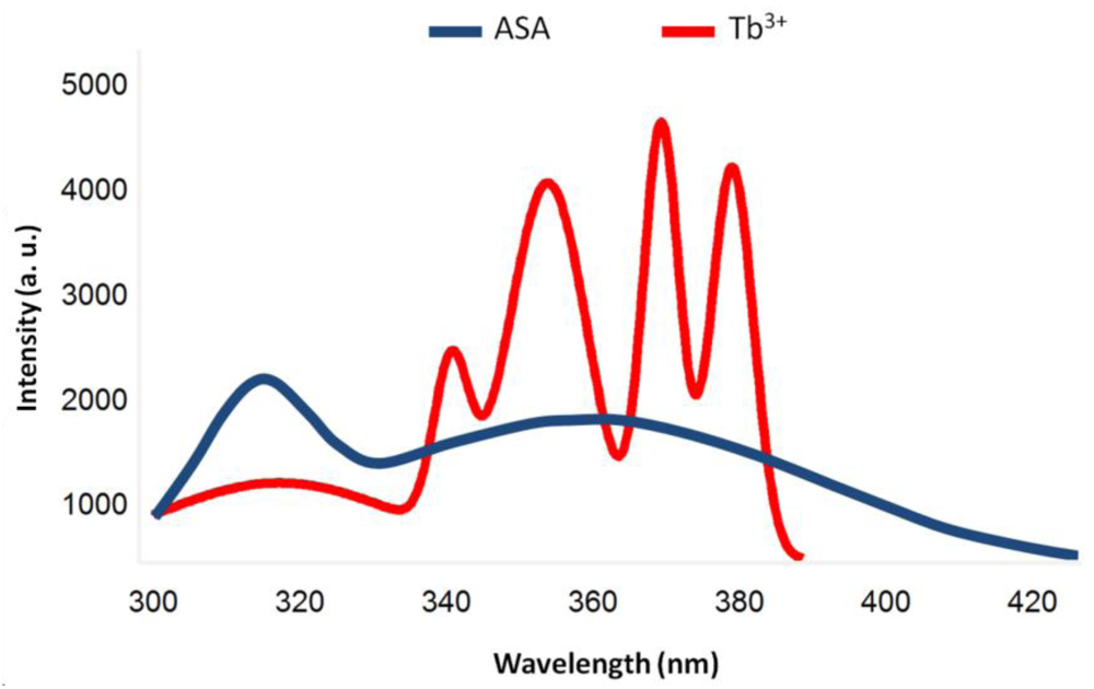 Energy transfer from the ligand to the RE ion was concluded by measuring the maximum absorption of the ligand using UV-Vis absorption spectroscopy. ASA in water and in methanol produced a maximum absorption peak at 276 nm. Characteristic peaks of Tb3+ existed in the emission spectra of nanoparticles synthesized in water and methanol upon direct ion and ligand excitation.