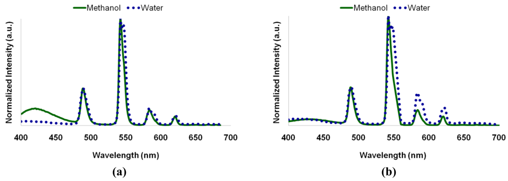 Organic dyes utilized in photonic devices produce broad emission spectra (FWHM = 50–200 nm) where narrow emission spectra (FWHM < 5 nm) are generally preferred [30] for improving color saturation [31] in various light-emission applications such as displays and fashion. The photoluminescence of the polymer nanocomposites synthesized in water and in methanol was measured by normalizing the spectra at 543 nm and applying Lorentzian fits. The FWHM at the 490 nm emission peak was computed as it provides insights into the affects of changes in the environment resulting from the ligand and agglomeration [32]. In both cases of direct ion and ligand excitation, the spectral peaks are reasonably narrow (~9 nm for water and ~8 nm for methanol), though not statistically different given the spectrometer slit-width.