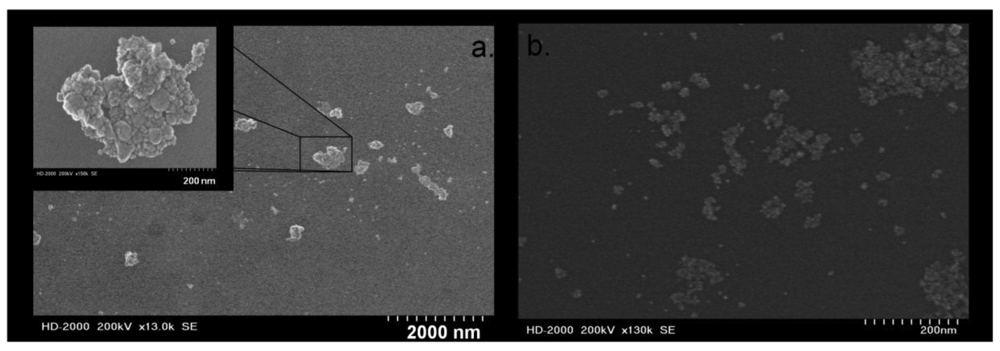 The composition of the nanoparticles were characterized utilizing a scanning transmission electron microscope (STEM, Hitachi HD2000, Pleasanton, CA, USA) equipped with an Oxford INCA Energy 200 Energy Dispersive Spectrometer (EDX).