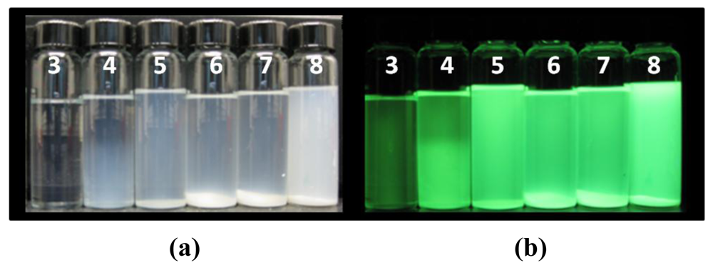 The pH of the methanol nanoparticle suspension was increased by 1 pH unit starting with a pH of 3 to a pH of 8 in Figure 7(a,b), respectively. Figure 7(a) shows the suspension under conventional room light and Figure 7(b) displays the luminescence of the nanoparticle suspensions when excited with ultraviolet light at the wavelength of 365 nm. The suspension is clear at the synthesis pH of 3. A change in suspension appearance is visually apparent between the synthesis pH of 3 to 4 and sedimentation occurs where large agglomerates fall out of suspension due to gravity in the suspensions synthesized at pH ≥ 5.