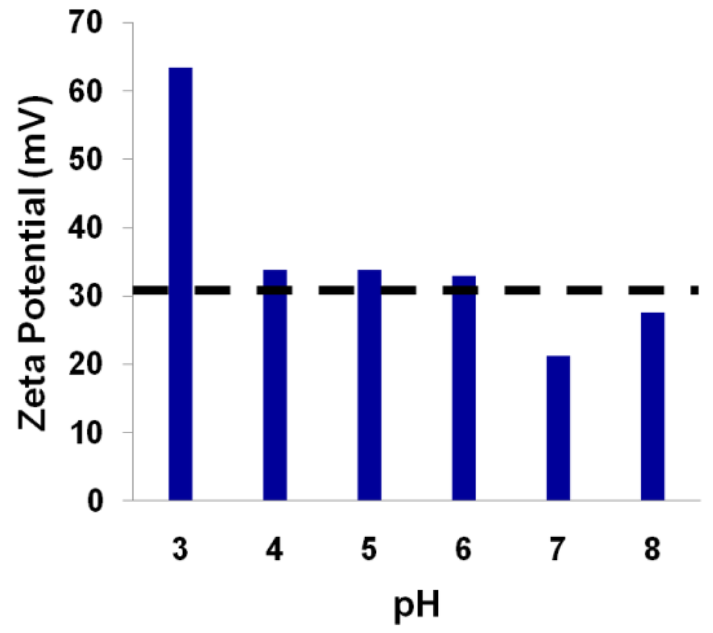 Particles displayed positive surface charges in this research as determined by zeta potential measurements, which represents the degree of repulsion between adjacent particles having the same charge [37]. The positive surface charge can be counteracted by the addition of a Lewis base into the suspension which can promote the strengthening of negative charges leading to colloidal instability. Suspensions with zeta potential values between +30 to −30 mV are considered to be unstable. Zeta potential values below the black dotted line in Figure 8 indicate values below +30 mV; i.e., unstable suspensions. The zeta potential measurements verify the visual analysis of potential agglomerate formation beyond the synthesis pH of 3.