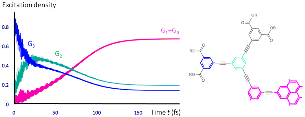 The chromophores from which dendrimers are built, often involving benzene rings, are commonly large enough for them to support local vibrational modes, of a sufficient number that the corresponding quantum levels overlap in a broad continuum. In consequence, there is a significant bandwidth to the corresponding absorption profile, and the electronic excitation of each such chromophore is usually also accompanied by significant engagement with the vibrational modes. Ultrafast processes of intramolecular vibrational relaxation (IVR) ensue, before decay of the electronic excited state (usually a singlet state) occurs; the level in the electronic excited state from which decay occurs is then, in general, the lowest in its vibrational continuum. Whereas the chromophore in isolation might decay by fluorescent emission, the key to light-harvesting efficiency in dendrimers is intramolecular RET, so that the energy is not lost to the system but passed on to another chromophore component. Again, the linkages between chromophore units, such as ethynyl or ether groups, are commonly chosen to preclude an alternating bond conjugated structure that would expedite electronic delocalisation (which would result in longer-wavelength absorption). Electron exchange within the dendrimer thus becomes essentially negligible [29,30]. Accordingly the dominant energy transfer mechanism is RET, whose mechanism is traditionally conceived in terms of a coupling between the transition dipoles.