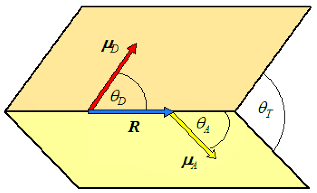 In Equation (2), ω is an optical frequency and FD (ω) represents the normalized line-shape for the fluorescence spectrum of the donor (τD* being the associated radiative decay lifetime); σA(ω) is the corresponding line-shape for the linear absorption cross-section of the acceptor. The inverse proportionality of the rate with the lifetime of the donor signifies the fact that energy transfer is generally expedited by excited states that have the faster decay rates. The integral within which the line-shape product appears, known as the spectral overlap, is one of the key determinants of energy transfer efficiency [32]. Another prominent feature in Equation (2) is the κ factor, which depends on the orientations of the donor and acceptor with respect to each other, and also with respect to their mutual displacement vector R;