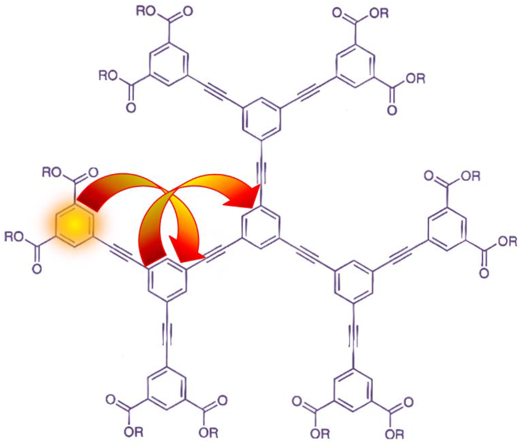 Photobiological and dendrimeric systems deploy similar energy harvesting mechanisms in photon absorption and energy transfer to a central trap [20–22]. The photochemical features which they share include: a multiplicity of peripheral chromophores that can initially absorb light, producing short-lived electronic excited states; a mechanism for rapid transfer of the resulting excitation towards a trapping site (stepwise resonance energy transfer, RET); a geometric layout that expedites trap-directed routing, governed by chromophore separation and orientation, and a process for collecting and capturing the energy acquired at the trap. In the construction of light-harvesting dendrimers, each of these photochemical and photophysical principles is put to highly effective use: the repeated branching of the polymer structure, together with the three-dimensional folding that occurs in all but the smallest systems, supports a special proliferation of chromophores on the outermost surface, and the inner, building-block chromophores act with high efficiency as transient hosts for the excitation energy en route to the core. Moreover, the convergence of the dendrimer branches towards the core also assists the pooling of energy, in the event that more than one photon is initially captured upon the outer surface.