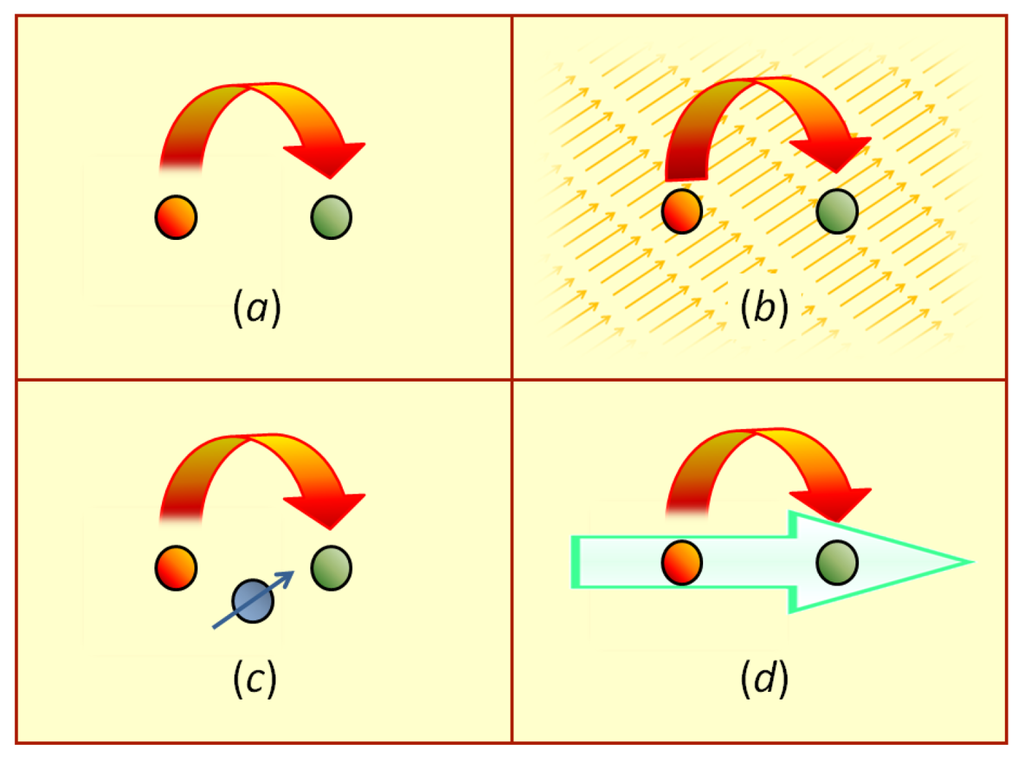 It is also possible to exert control over the directionality of excitation flow by the operation of external influences [38]. Examples of such modifications, produced on application of an electrical or optical stimulus, are illustrated by the simple representations given in Figure 4: (a) depicts the regular form of RET; (b) the application of a static electric field; (c) the incorporation of an ancillary polar species; (d) the throughput of off-resonant electromagnetic radiation. The involvement of static fields in (b) extends in principle to the influence of a host medium, as for example through solvatochromic shifts in the excited-state energy levels of exposed chromophores [39]. Most significantly, based on option (d), an all-optical method has been proven to enable excitation transportation to be completely switched on or off, such that the energy flow from donor to acceptor is subject to a controllable, photo-activated switch; the detail on all-optical switching of this type is beyond the scope of this review, see [40–43] for greater depth.