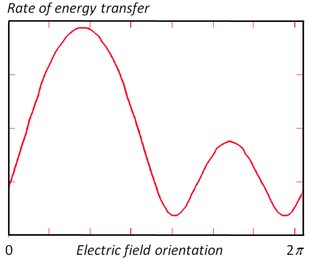 Consider first a donor-acceptor pair positioned in a static electric field, as in Figure 4(b). It has been shown that the rate of transfer between the chromophores will be modified under such conditions, primarily as a result of their state wavefunctions being perturbed by interaction with the field [44]. This is readily understood: for each chromophore, the electron charge distribution of both the ground and excited electronic states will experience a degree of distortion. The graph of Figure 5 exhibits a typical form of variation in the rate of energy transfer, according to the orientation of the static electric field (based on typical values of 1 × 106 V cm−1 for the static field strength and ∼1.5 D for the transition dipole moments). Moreover, when the static field engages with a transition, it is associated with selection rules that formally identify with those of a two-photon transition. Consequently it is possible, in a case where either the donor or acceptor transition is (single-photon) dipole-forbidden, for the application of a static electric field to specifically produce and direct energy transfer, allowing a switchable electric field to control the delivery of energy to the acceptor. In this respect the effect is a static analogue to the all-optical switching mechanism discussed below.