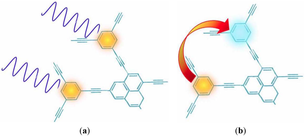 In this paper we have seen how the singular photophysical properties of dendritic polymers are engineered and deployed, commonly in the cause of light harvesting. Although much of the context for this analysis has concerned dendrimeric systems acting as solar energy harvesters, there are several other important and emerging areas of application deserving mention, including molecular sensing [104–106], catalysis [104,107], medical photonics [104,108] and light-emitting diodes [109–111]. Most uses exploit the following generic properties: the possession of a multiplicity of chromophores that are responsible for initial photon absorption, and which can also act as relays; these groups display broad and intense absorption bands, and correspondingly strong emission bands; RET mechanisms are in place for the efficient transmission of electronic excitation by a sequence of transfers, providing a means for the direct routing of each excitation from peripheral to core chromophores; irreversibility of energy capture is achieved through intramolecular relaxation (energy losses) at each intervening site.