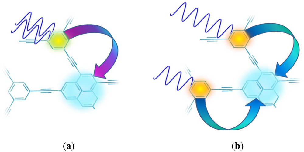 - Swallen, S.F.; Shi, Z.-Y.; Tan, W.; Xu, Z.; Moore, J.S.; Kopelman, R. Exciton localisation hierarchy and directed energy transfer in conjugated linear aromatic chains and dendrimeric supermolecules. J. Lumin. 1998, 76–77, 193–196. [Google Scholar]