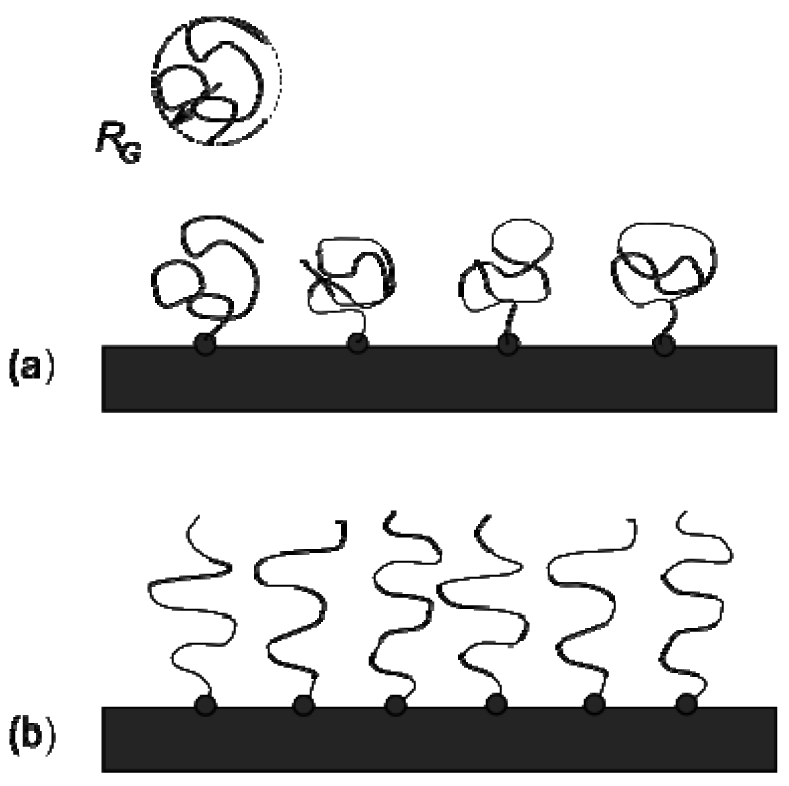 When polymer chains are grafted at one end to a surface at sufficient density to allow the chains to overlap, they stretch away from the surface into a brush-like conformation [11]. When free in solution, the polymer chain is in the coil conformation and has a size characterised by its radius of gyration, RG. When chains are grafted to the surface, the distance between grafting points is referred to as the grafting distance d, and the number of chains per unit area is the grafting density σg = d−2 (measured as the number of chains per nm2, however care must be taken in the literature as σ is sometimes used as the area per grafted chain [12]). At low grafting density, where RG << d, the chains are isolated upon the surface and adopt the so-called mushroom regime [13] (Figure 1). At grafting densities where d becomes comparable to RG, neighbouring polymer chains begin to overlap and are forced to stretch away from the surface due to repulsive excluded volume interactions. The equilibrium height of the polymer brush layer is dictated by the competition between the stretching of chains away from the surface and the entropic elasticity that resists such stretching.