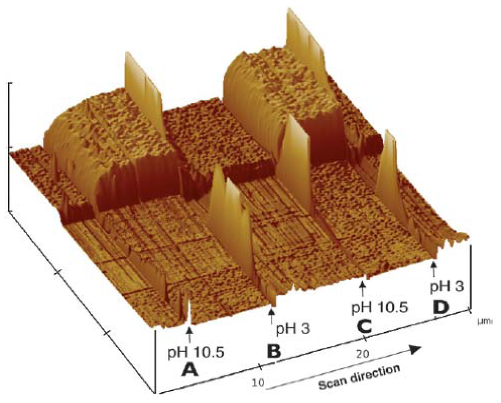 The strong polyelectrolyte PTMAEMA is more swollen than the neutral case due to the presence of electrostatic effects. The degree of swelling in PDMAEMA and PTMAEMA brushes decreased as the grafting density was increased, in accordance with the respective power law exponents of −2/3 and −1 predicted [50] by scaling theory. Measurements on the PTMAEMA strong polybase brushes also illustrated the turnover between osmotic brush regime and salted brush regime as the salt concentration is increased. The thickness scales to the predicted power law exponent of −1, which was reproduced for samples of two different grafting densities. This also confirms the group's previous results for strong polyelectrolytes [45]. These vindications of the scaling approximations are particularly rewarding and difficult to obtain since real experimental systems rarely conform without ambiguity to the precisely defined regime behaviour. In the same study [50], the behaviour of PDMAEMA weak polybase brushes in response to changing pH was also presented, using data from both ellipsometry and neutron reflectivity. The brushes were fully swollen at low pH (at a size similar to that of the strong polyelectrolyte PTMAEMA in water). As the pH was increased the brush height decreased, tending towards the value for PDMAEMA in methanol (neutral polymer behaviour). Polyampholyte brushes, that is brushes with both polyacid and polybase groups appearing upon the same chain, have shown a larger pH response than homopolymer polybase brushes by responding at both extremes of the pH scale instead of just one [51]. Parnell et al. [52] measured the real-time swelling and collapse of a poly(methacrylic acid) weak polyacid brush using atomic force microscopy. Polymer brush material was removed from the silicon surface using a scratch from a scalpel blade, taking care not to damage the substrate. Contact mode AFM was used to measure the step height of the edge of the intact polymer layer as solutions of pH 10.5 and 3 were introduced to the sample environment. Figure 10 clearly shows the change in height of the polymer brush as it becomes swollen at high pH and relatively collapsed at low pH. The actuating timescales of responsive polymer brushes have implications for applications in particular for the area of microfluidics, where channels or pores could be restricted/actuated by the fast switching of responsive brushes to enable sorting of molecules.