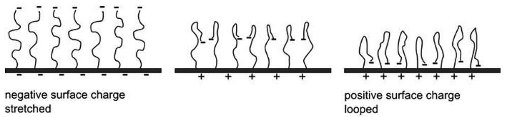 As the grafting density increases, and the grafting distance decreases, the polymer molecules are increasingly stretched away from the surface in a brush-like equilibrium conformation. Unlike the bristles of a sweeping brush, whose stiffness is the dominant factor in keeping them perpendicular to the grafting surface, in a polymer brush it is the repulsive interactions between neighbouring chains that keep them stretched away from the surface, while the polymer molecules remain flexible on length scales comparable to the thickness of the brush (∼10 nm). In neutral polymer brushes, the monomer-monomer excluded volume interactions are responsible for the repulsive interactions. In polyelectrolyte brushes, where electrical charges are present upon the polymer chains, electrostatic interactions become important either directly through repulsive interactions between charged monomers, or indirectly since they dictate the distribution and hence the osmotic pressure of the counterion cloud which remains bound to the brush to preserve electroneutrality.