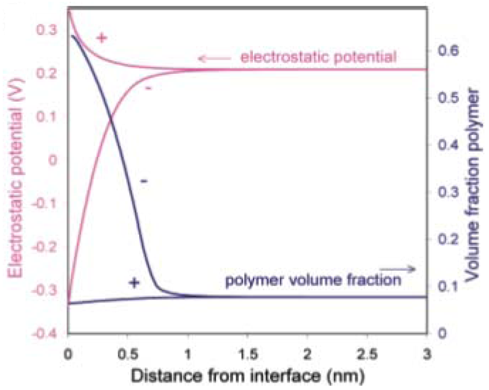 Zhou and Huck [65] demonstrated that AFM microcantilevers grafted on one side with a poly[2-(methacrylolyloxy)ethyl] trimethyl ammonium chloride (PMETAC) strong polyelectrolyte brush layer could be actuated by the application of a voltage between the tip holder and a remote electrode within a liquid cell containing weak salt solutions. This effect has been explained by the surface stresses due to voltage-induced conformational changes within the polyelectrolyte brush layers. A model based upon a modified Poisson-Boltzmann equation coupled to Stoney's equation [65] predicted well the bending of the cantilever as a function of applied voltage. It also predicted changes in the volume fraction profile of the polyelectrolyte brush (see Figure 12), though these were never demonstrated experimentally. Specifically, it was predicted that a strong polycationic brush would be swollen by a positive applied bias (positive voltage at the grafting surface) and de-swollen by a negative applied bias (negative voltage at the grafting surface).