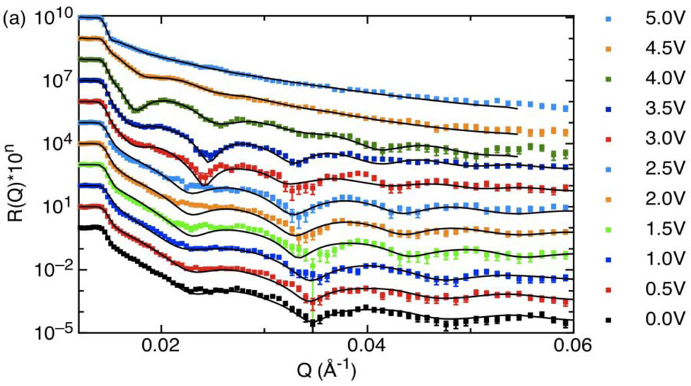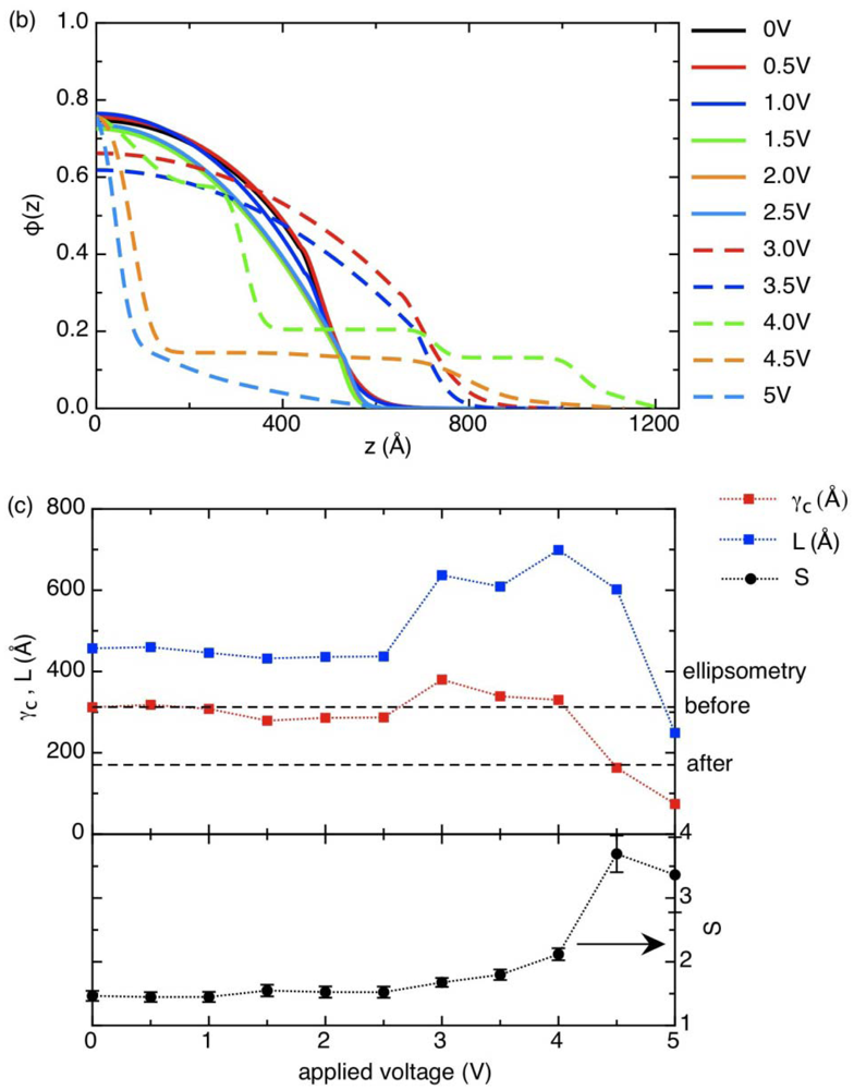 We have recently demonstrated that weak polyelectrolyte brushes may be partially or strongly swollen by applied voltages [69]. Poly(2-(dimethylamino)ethyl methacrylate) (PDMAEMA) weak polybase brushes were grown from silicon substrates. Changes in the profiles of the brushes in response to DC voltages applied between the brush substrate and a parallel electrode some distance away in the surrounding water were measured using ellipsometry and neutron reflectometry [70]. Neutron reflectometry data (Figure 13) showed that positive applied voltages caused moderate swelling, strong swelling, and finally damage of the brush as the magnitude of the voltage was increased from 0.5 to 5 V. In this case positive bias means the positive terminal of the voltage supply was connected to the brush substrate. The range of swelling was shown to be larger than that accessible via pH-induced swelling, and this coupled with the versatility of electrical stimuli over physical-chemical stimuli (e.g., changing the solution pH) makes the future of voltage-induced actuation appear very promising. Migliorini [71] has used self-consistent field theory to study the effect of electric fields upon semi-dilute, strong polyelectrolyte brushes, predicting swelling of polycationic brushes upon application of a positive bias (positive terminal in contact with the brush grafting substrate).