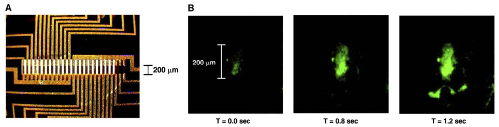 Huber and co-workers demonstrated the controlled holding and release of proteins by utilizing the temperature response of PNIPAM in a custom made microfluidic device [82]. At room temperature, while the polymer was swollen, there was negligible adsorption of globular protein, whereas above the LCST when the polymer brush collapses allowing extensive adsorption. They showed excellent control over the PNIPAM brush layer by using highly integrated micro-hotplates that can be spatially addressed with fine spatial control and also rapidly addressed. They were able to heat above the LCST in less than 1 ms whilst cooling took longer as it was not actively cooled. Figure 16 shows the patterned electrode used (Figure 16(a)) to heat the PNIPAM layers along with a sequence (Figure 16(b)) showing the release of protein after the layer was taken below the LCST.