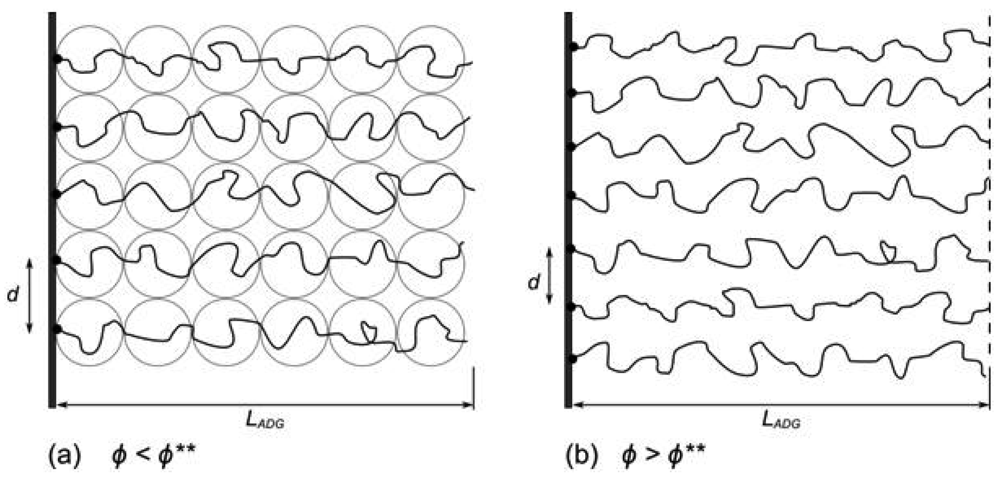 The simplest model of a polymer brush assumes a step-function volume fraction profile, comprising monodisperse chains stretching away from the surface with each chain end located the same distance away from the grafting surface giving a layer thickness L, every chain having the same degree of stretching. Alexander and De Gennes refined this into the blob model for a polymer brush [14,15] which divides the chains of the brush into a series of blobs as depicted in Figure 2(a). Assuming that the distance between the grafted chains d dictates the dimension of each independent blob of polymer, and that the brush is in the semi-dilute regime in a good solvent a relation between the brush height L, the monomer size a, and the grafting density σg, is derived (Equation (1))