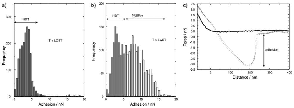 The potential for PNIPAM as a switchable surface was shown by Jones et al. [34] by performing a series of high resolution force microscopy measurements to measure the change in adhesion for a patterned PNIPAM polymer brush. Their work showed that their layers possess a reversible phase transition between hydrophilic and hydrophobic when traversing the LCST temperature. This can be clearly seen in Figure 4(c) where two example retraction curves are shown, one below and one above the LCST, with a large difference in adhesion.